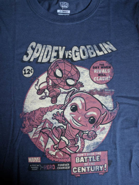 Poursuivons avec le t-shirt qui me plaît beaucoup, une version Funko d’un affrontement de Spider-Man et Green Goblin. Moi j’adore ces t-shirts, pas seulement pour leurs dessins, mais surtout pour leurs qualité. Le dessin ne pars pas avec le temps et les lavages, et le dessin est soft, pas comme ces t-shirts qui ont des autocollants durs.